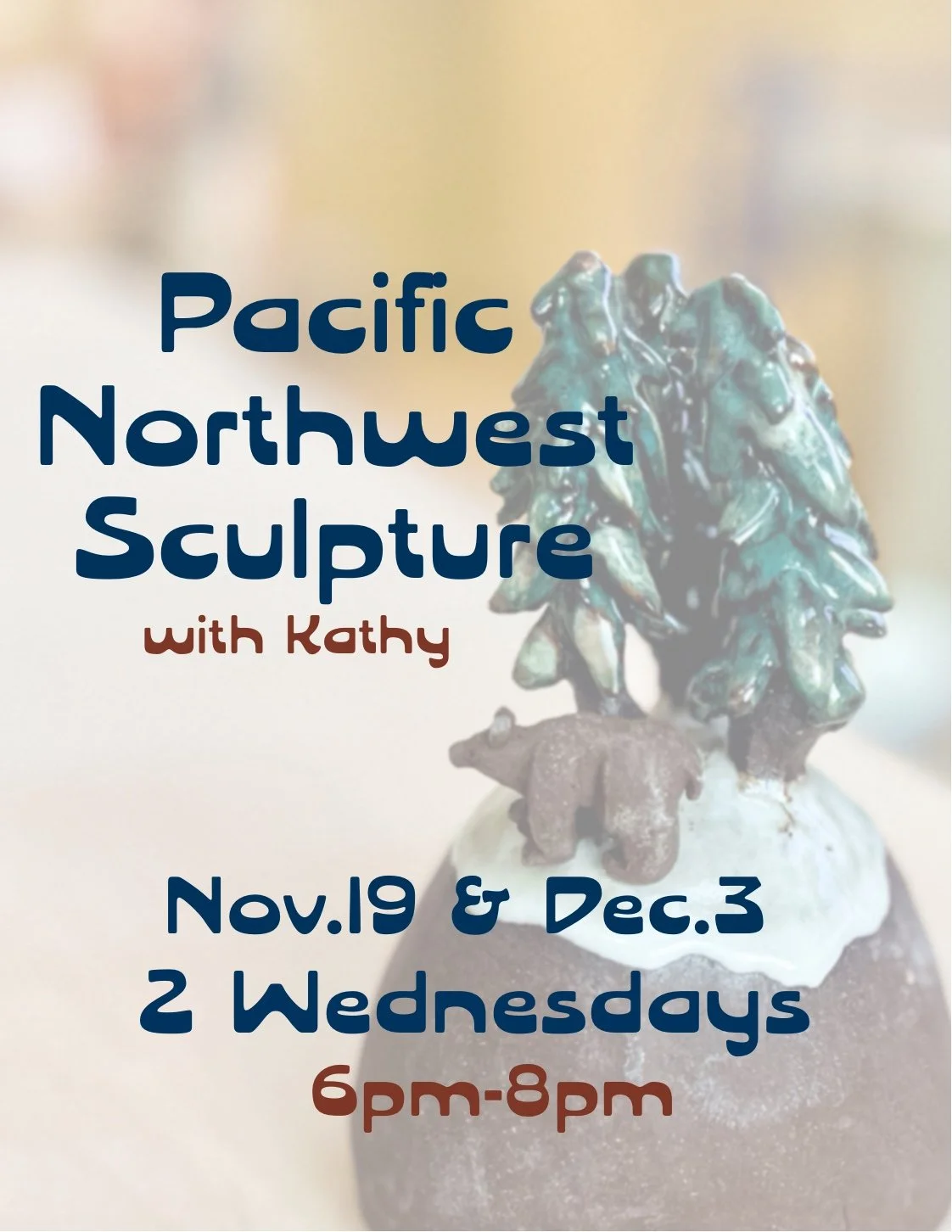 • Create your own tiny world inspired by the wild beauty of the Pacific Northwest! In this hand-building clay class, we’ll craft small “mounds” or miniature mountain sculptures—complete with evergreen trees, roaming bears, and maybe even a tent. Kathy will lead you in different techniques to shape your landscapes, then show you how to add texture and detail to bring your woodland scene to life.